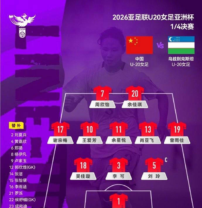 本场比赛,中国U20女足延续了小组赛期间的稳定战术,由门将刘晨担任防线守护者,后防线由吴佳璇、李可、刘玲和谢宗梅组成,形成了一道严密的防守屏障。中场方面,王爱芳、余星悦和肖亚飞共同掌控比赛节奏,而前场的曾雨佳、周欣怡与余佳琪则联手主动进攻。这套均衡的阵容不仅力求再现小组赛的全胜佳绩,还希望继续零失球的出色表现,争取获得世青赛的入场资格。