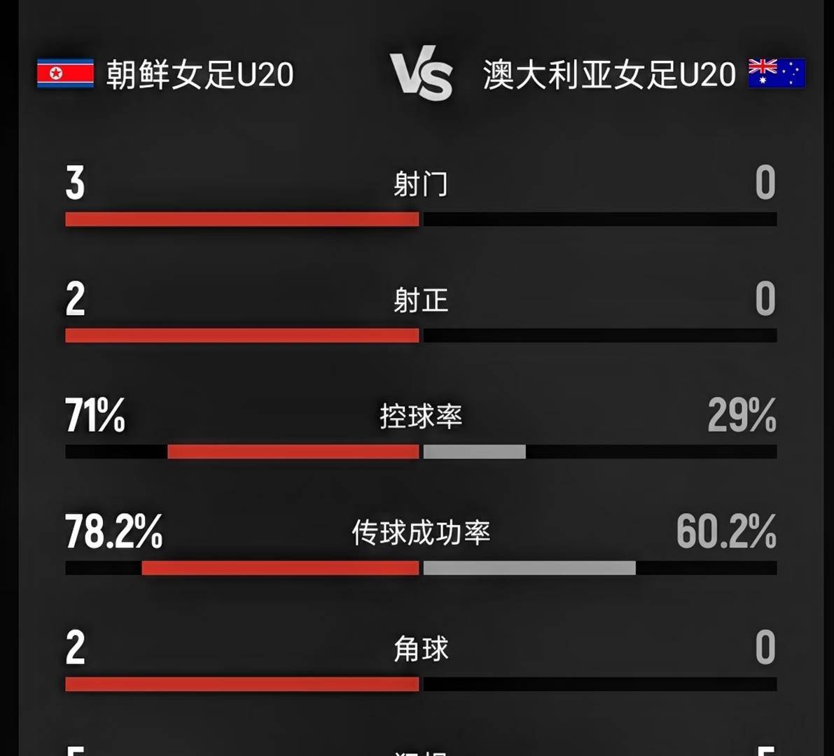 根据现场的数据统计,整个上半场,朝鲜队完全掌控了比赛节奏。 她们的控球率超过了70%,射门次数和获得的角球数都远远高于对手澳大利亚队。 澳大利亚女足在整个上半场45分钟里,没有获得任何一次射门机会。