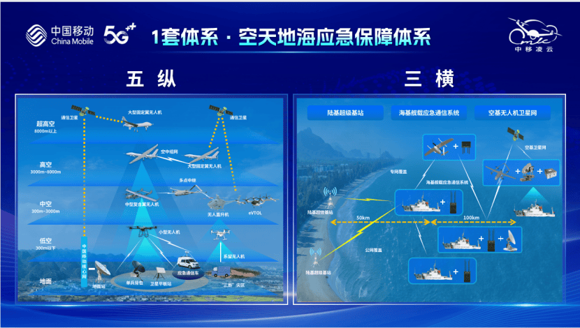 1套体系:成研院构建了“五纵三横”的应急通信保障体系。五纵体系涉及地面至超高空的多层次应急通信保障,通过不同类型的无人机搭载自主研发的中移应龙机载应急通信基站,实现在多应急场景下的立体应急通信保障。三横体系专注于海上应急救援,通过陆基、海基、空基系统实现分级协同通信组网。