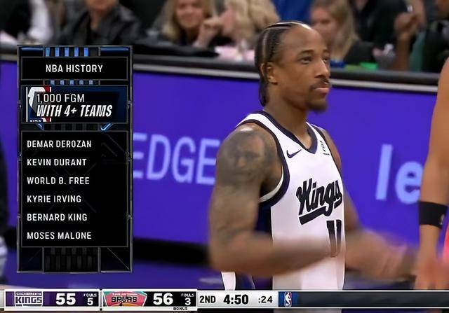 德罗赞在4支球队达成命中1000记运动战进球里程碑,成为NBA历史第6人,前5人分别是杜兰特、弗里、欧文、伯纳德-金与摩西-马龙。