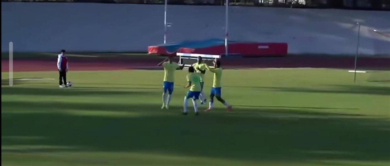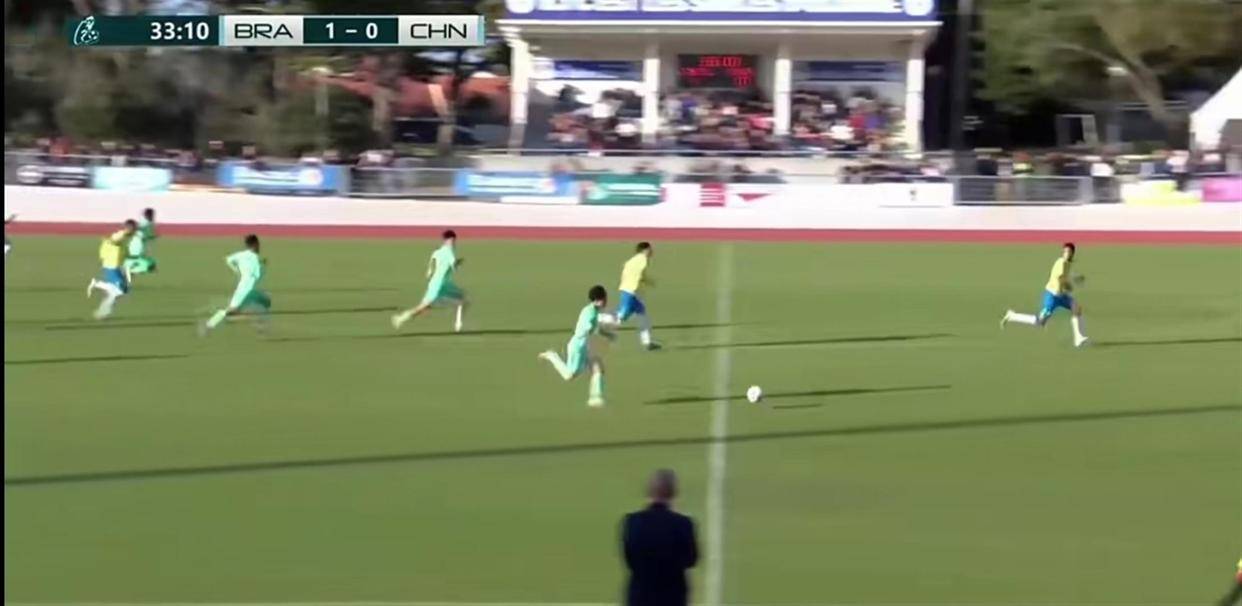 巴西U16是世界同年龄段梯队中的顶尖队伍,球员的身体天赋、技术细节和球感都处于领先水平。 面对这样的对手,多数队伍都会陷入被动死守、毫无还手之力的困境。 但这支中国U16没有一味退缩,球员们从比赛第一分钟就开始高位逼抢,即使个人技术不如对手,也通过积极的跑动和协防来弥补差距。 第11分钟,门将江承恩在一次出击中与对方球员相撞受伤,经过队医进场治疗后才继续比赛,这个小插曲展现了比赛的激烈程度。 第22分钟,刘凯源接应直塞突入禁区,扛住巴西后卫扣球摆脱时倒地,裁判没有表示,这次进攻展现了中国前锋的勇气。