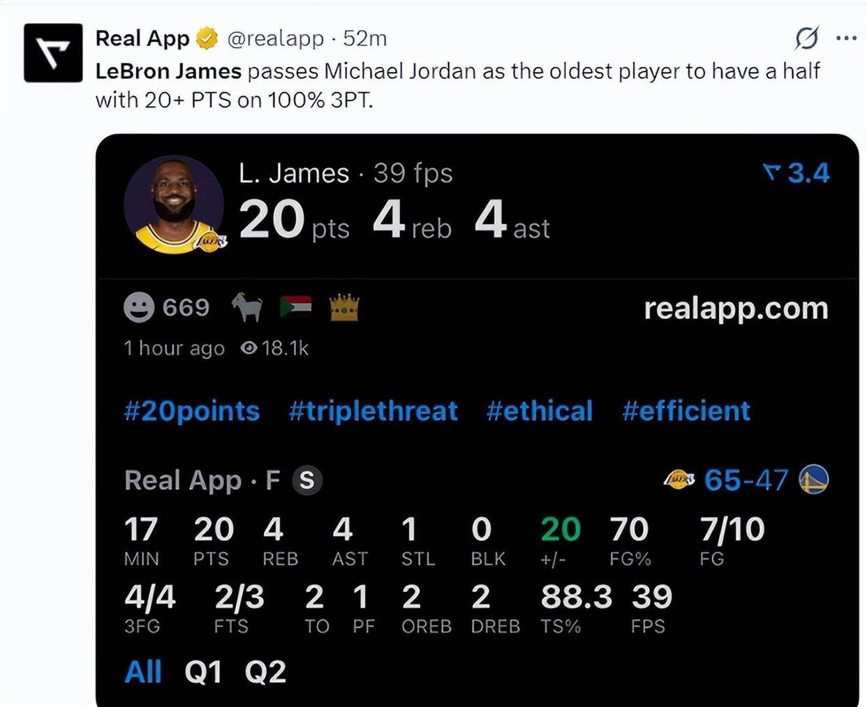 这场比赛,勒布朗·詹姆斯在创造纪录的道路上又迈出了坚实的几步。他一举创下了三项值得铭记的纪录。第一项,他以41岁61天的高龄,超越篮球之神迈克尔·乔丹,成为NBA历史上在上半场比赛中得到至少20分且三分命中率保持100%的最年长球员。乔丹在40岁4天时曾做到过这一点,而詹姆斯将这个纪录又提升了一年多。第二项,他本场命中了4记三分球,这使得他湖人生涯的三分命中总数达到了1002个。他因此成为洛杉矶湖人队历史上第二位命中至少1000记三分球的球员,排在他前面的只有已故传奇科比·布莱恩特,科比为湖人命中了1827记三分。同时,詹姆斯也成为了NBA历史上第一位在三支不同球队都命中至少1000记三分球的球员,另外两支是克利夫兰骑士和迈阿密热火。第三项,在本世纪所有40岁以上的球员中,单场得分达到20 的次数排行榜上,詹姆斯以59次遥遥领先。而其他所有40岁以上球员的20 次数加起来,一共也只有45次。詹姆斯一人的次数,就超过了其余所有人的总和。
