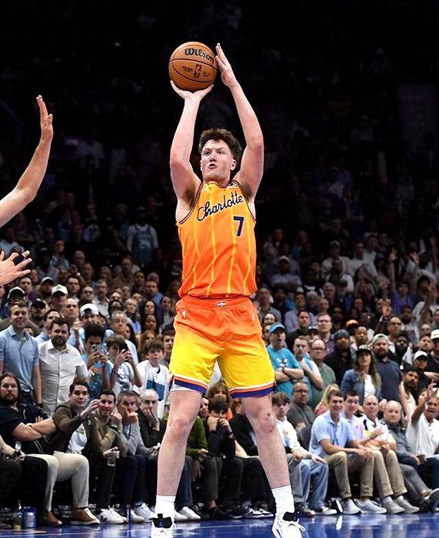 但今年剧本彻底跑偏了。4号秀克尼佩尔在黄蜂这支鱼腩球队,硬生生打出了历史级射手的表现。62场比赛打完,他场均19.2分的成绩单看着不算炸裂,可仔细看细节会吓一跳:50%的总命中率堪比内线%的三分命中率甚至压过了库里最巅峰的赛季。更夸张的是他场均要扔7.9个三分,能进3.6个,这产量效率组合拳放在整个NBA历史都罕见。