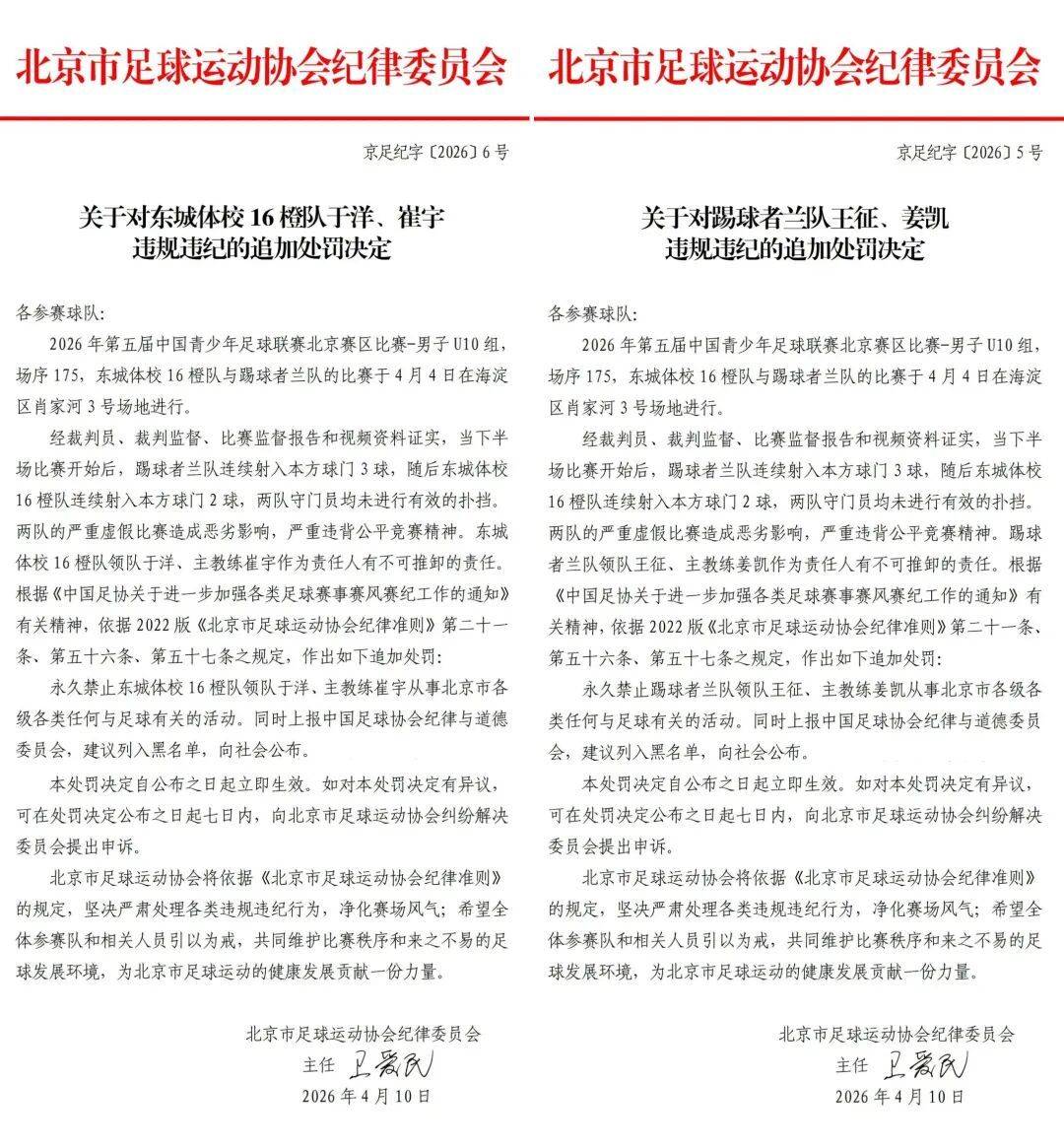 4月10日,北京足协的处罚“升级”,认为两队此举为“严重虚假比赛”,追加决定永久禁止东城体校16橙队领队于洋和主教练崔宇、踢球者兰队领队王征和主教练姜凯从事北京相关足球活动。