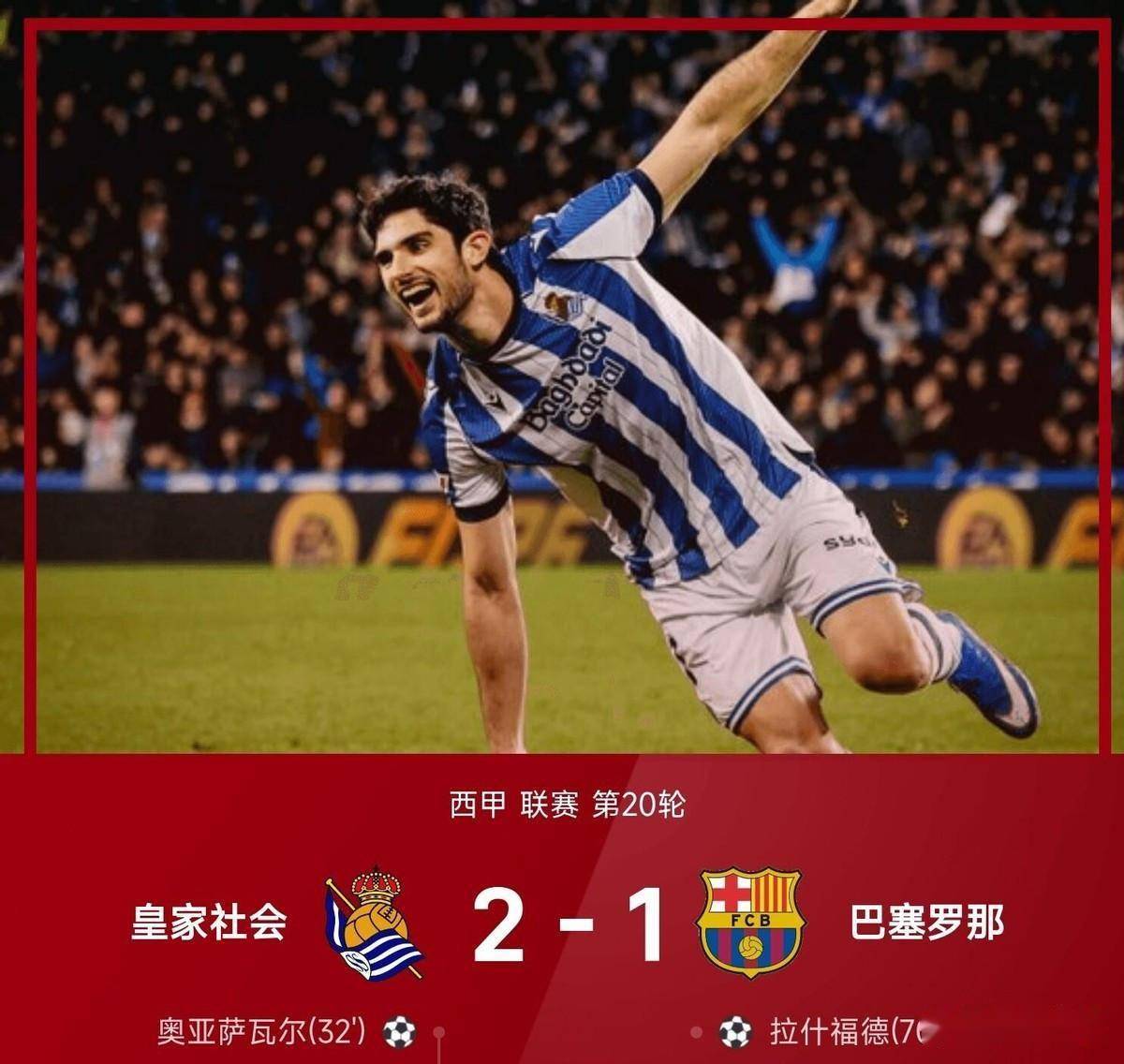 西甲第20轮,巴塞罗那客场挑战皇家社会。比赛开场仅仅28秒,主场作战的皇家社会就给了巴萨一个下马威。 奥亚萨瓦尔把球送进网窝,但边裁的旗子早已举起,越位在先,进球无效。 巴萨逃过一劫,但厄运的序幕刚刚拉开。